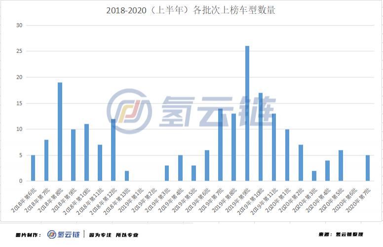 圖 2 2018-2020 年上半年各批次上榜數量情況(單位(wèi):輛) 來源:氫雲鏈整理