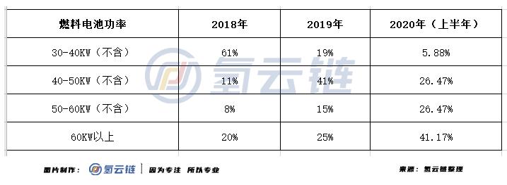 對比 2018 年,2019 年,可(kě)以看到國內燃料電池汽車在功率區間分布上(shàng)有變化明(míng)顯。30-40KW 區間(jiān)的占(zhàn)比(bǐ)明顯下降,40-50KW,60KW 及以上的兩個功率區間占比提升明顯,特別是 2020 年上半年(nián),出現(xiàn)多款高功率燃料電池車型,如一汽解放推出 100kW 燃料電池牽引車,這(zhè)也側麵說明國內燃料電池係統(tǒng)在技術上有了明顯的提升。