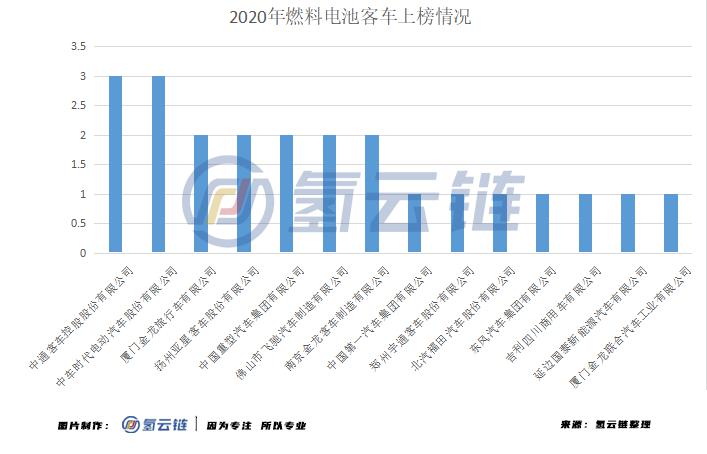 20 家上榜的車企中,絕大多(duō)數是已經有相關車型上榜的車企,新上榜車企隻有 2 家,為延邊國泰新能源和中國重汽(qì)集團。同時,各車企上榜數量分(fèn)布也較為平均,對比 2018 年車型集中度大幅下降,同 2019 年情況類似,這說明發展(zhǎn)氫能源汽車的車企增加的同時,車企研發新車型的熱(rè)情也在下降。
