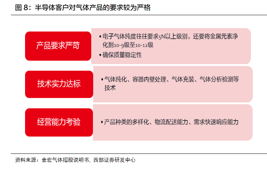 特種氣(qì)體主要應用於電子半導體、化工、醫療環保、顯示麵板、光伏等行(háng)業,在特種氣體的各個應用領域中,半導體客戶對氣體產品的要求較為嚴格,既需滿(mǎn)足純度要求又要確保質量穩(wěn)定性。