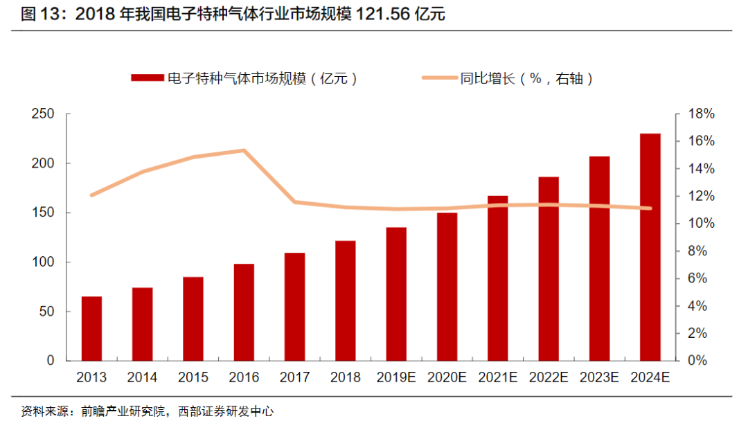 2018年全球電子(zǐ)特種(zhǒng)氣體市(shì)場規模(mó)45.12億美(měi)元,同比增(zēng)長(zhǎng)15.93%。根據中國(guó)半導體行業協會統(tǒng)計的數(shù)據(jù),2018年我國電子特種氣體的市場規模為121.56億元。預計伴隨下遊集成電路行業的(de)快速發展,國內(nèi)電子特氣需求(qiú)將保持較高增速,預計(jì)到2024年國內電子特氣市場(chǎng)規模將達到(dào)230億元。