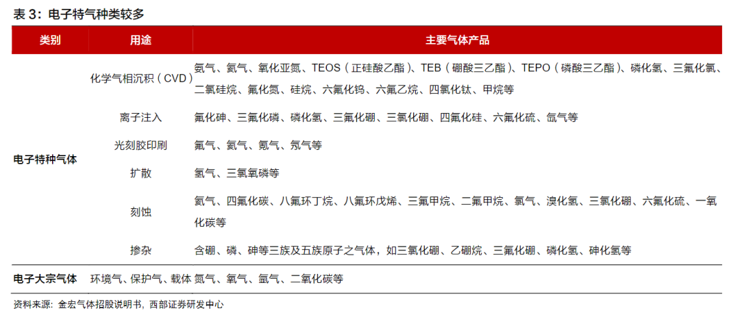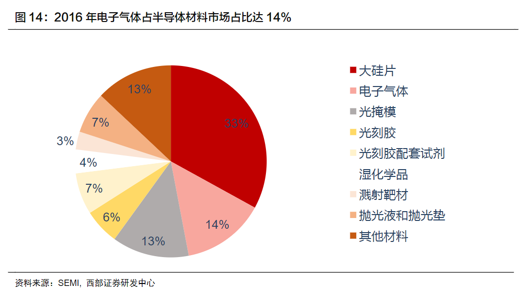 電子(zǐ)氣體是僅次於大矽片的第二大市場需求半導體材料,電子氣體在半導(dǎo)體材料市場占比達14%。電子氣體在電子產(chǎn)品製程工藝中(zhōng)廣泛(fàn)應用於離子注入、刻(kè)蝕、氣相沉積(jī)、摻(chān)雜等工藝,被稱為集成(chéng)電路、液(yè)晶麵板、LED及光伏等材料(liào)的(de)“糧食”和“源”。