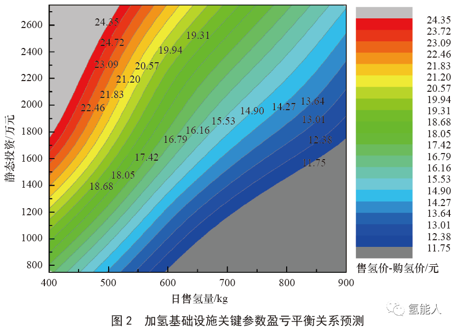 加氫工藝的複(fù)雜性導致(zhì)加氫站投資及運營(yíng)成本遠超天燃氣(qì)站,一座600 kg 日平均加氫能力(lì)的簡易固定(dìng)式加氫站,僅主要設備(bèi)與土建投(tóu)資就超過1000萬元,靜態總投資會達到1500萬元甚至2000萬元以上(shàng),圖2 預測了在不同(tóng)靜態總投資(zī)情況下,不同規模加氫站(zhàn)日售氫量(liàng)、氫氣價差等三個關鍵投資參數對應的盈虧平衡線,以600 kg 加氫站為例(lì),在滿負荷運轉的理(lǐ)想狀態,當靜態投資為1250 萬元時,保持氫氣售(shòu)價與進場價差價為14.35 元/kg 時,可實(shí)現盈虧平衡,當靜態投資達到(dào)2200 萬(wàn)元時,需要將氫氣售價與進場價差控製到19.25 元/kg 才能實現盈虧平衡;當加氫站規模較小、土地等非技術成本升高時,建設方以1750 萬元投(tóu)資400 kg 加氫(qīng)站,在滿負荷狀態,需要將(jiāng)售價與進場價差控製到24.35 元才(cái)能實現盈虧平衡。