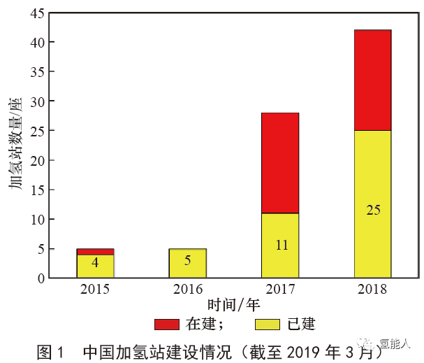 自2017 年(nián)以來,中國氫能產業呈現爆發式發展,現階段中國的應用市場主要以燃料電池大巴車與物流車為主(zhǔ),為了滿足車輛應用示範,各地已(yǐ)開始大(dà)規模規劃並建設保障性加氫站,截至2019 年3 月,中國已投產加氫站數(shù)量達到25 座(包括兩座內部整改站),較2017 年增加14 座(見圖1)。在已建成加氫站中,固定式加(jiā)氫站11 座,撬裝式加氫站14 座,此外,有(yǒu)17 座加氫站在建,加氫站分布主要集中(zhōng)在廣東、江蘇、上海、湖北、河北(běi)等地。