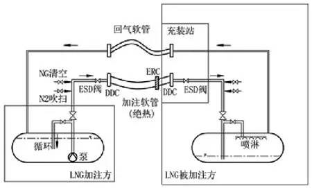 可行的LNG加注解決方案的設計取決於對安全性(xìng)、可操(cāo)作性、經濟性三者的平(píng)衡(héng)。圖6為一典型水上LNG加注係統(tǒng)。該係統的工作原理為(wéi):用泵(bèng)將LNG通過加注軟管(或加注臂)泵送到接收(shōu)方(fāng)儲罐中。在軟管的兩端(duān)都裝有緊急切斷閥(ESD),如(rú)果發生泄漏或操作異常,ESD可自動或手動關閉,為防止(zhǐ)過壓,ESD的響應時間在30s左右。當ESD關閉時,為(wéi)防止壓(yā)力振蕩,儲罐配備有自循(xún)環係統(tǒng)進行(háng)降溫和降壓。為防止加注方與接收方之間過(guò)大的相對運動,在軟管上裝有緊急脫離裝置(ERC)。加注軟管兩端(duān)采用幹式快速接頭(DryDisconnectCouplings,DDC)以(yǐ)防止泄(xiè)漏。在加注之(zhī)前,加注(zhù)軟管需(xū)要用LNG的蒸發氣進行吹掃(sǎo)和預冷,加注(zhù)之後,軟管中的LNG要排幹(gàn),然後用氮氣吹掃(sǎo)加注軟管和回氣管。