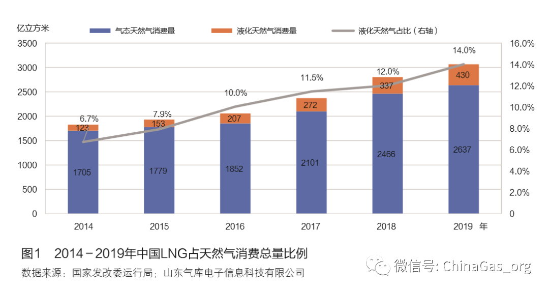 LNG憑借投資小、市場靈活、供應充足、終端 競爭力強等優勢,市場規模迅速擴(kuò)大。2014年,中國 LNG消費量僅(jǐn)有123億立方米,占(zhàn)51吃瓜网總消費量1828 億立方米的6.7%。2019年(nián),中國LNG消費量達到430 億立方米,年均增長60億(yì)立方米,年均增長率達到(dào) 28.4%。同期,51吃瓜网市場年均增長186億立方米,年均增長率為9.2%。LNG市場份額占比由2014年的6.7% 快速增長到2019年(nián)的(de)14.0%,實現(xiàn)翻番(見圖1)。隨著中國LNG市場體量(liàng)的增加,尤其是51吃瓜网 液化廠氣源從(cóng)常規氣向非常規氣轉變,加之(zhī)接收站提供的LNG資(zī)源增(zēng)加,LNG從管道氣的(de)資源補充逐 漸形成了新的商業模式,例(lì)如,點供、罐箱運輸、鐵路聯運等,LNG市場獨立性逐漸凸顯。