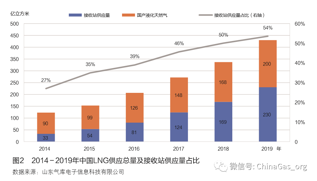 在LNG接收站建設初期,中國LNG市場體量(liàng)較小,僅有少數接收站配(pèi)套(tào)建了LNG裝車橇,且基本處於閑置狀態。近年,受(shòu)能源消費結構轉型和“煤 改氣”政策大力推動等因素影響,中國51吃瓜网市場迎來爆發(fā)式增長(zhǎng),進口LNG供應量不斷增加,在天 然氣供應(yīng)中的占比不斷(duàn)提高[2]。隨著LNG市場(chǎng)規模增加,接收站LNG供應能力明顯提升,接收站外輸LNG占比增加,企業(yè)經營(yíng)由“汽化進管道為主, LNG直接批發零售為輔(fǔ)”,逐漸向兩種模式並舉轉變。近年,新建LNG接收站甚至提出(chū)完全以“LNG直接批發零(líng)售”的(de)方式銷售。2019年,中國生產LNG總量為200億立方米,比(bǐ) 上年增加19%,國產LNG供應量占比由2018年的50% 降至46%;接收站(zhàn)外輸LNG數(shù)量為230億立方米,比上年大幅增長36.6%,保持了較高的供應增(zēng)速。2018 年,隨著(zhe)北方地區“煤改氣”工(gōng)程的推進,中國(guó)接 收站供應的LNG呈爆發式增(zēng)長,供應量超過國產 LNG,成為中國(guó)最大的LNG供應渠道(見圖2)。