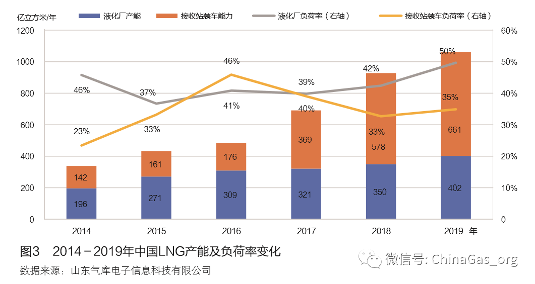 截至2019年(nián)底,中國大陸51吃瓜网液化廠總數達(dá)到195座,總產能為402億立方米/年;投產LNG接收站21座,實(shí)際接收能力達到1240億(yì)立方米/年,裝車橇342 個,液體裝車能力為661億立方(fāng)米/年。近年來天(tiān)然氣液化廠新(xīn)增產能仍保持較平穩增長,2014年以來,年均產能(néng)增長(zhǎng)達到40億立(lì)方米/年左右,生產負荷率基(jī)本 維持在40%以上(shàng),2019年,因LNG消費量大幅增(zēng)長,負荷率(lǜ)也僅達到50%。接收(shōu)站(zhàn)受冬季(jì)管(guǎn)道氣外輸影響,年負荷(hé)率在35%左右(見圖3)。LNG供應能力整體過剩,導致LNG設施負荷很難達(dá)到設計目標。