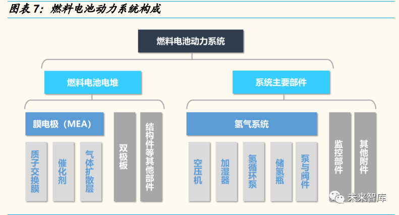 燃料電池主(zhǔ)要包(bāo)括電堆(duī)、氫氣係統,其中電堆以(yǐ)膜電(diàn)極(MEA)、雙極板 為主(zhǔ)。氫(qīng)氣係統以空壓機、增濕器、氫(qīng)循環泵、高壓氫(qīng)瓶(píng)為主。