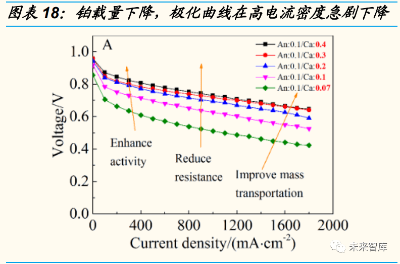 提高耐久(jiǔ)性為(wéi)當前關鍵,未來低鉑載為研發方向。1)燃料電池在車輛運行 工(gōng)況下,催化劑性能會(huì)發生衰減(jiǎn),如在動電位作用下(xià)會發生 Pt 納米顆(kē)粒的 團聚、遷移、流失,在開路、怠(dài)速及啟停(tíng)過程產生(shēng)氫(qīng)空界麵引起的高電位導致的催化劑碳載體的腐蝕,從而引起催化劑(jì)流失。2)目前(qián)最優(yōu)催化(huà)劑仍 是 Pt 和(hé) Pt 基催化劑,常(cháng)用的商業催(cuī)化劑為 Pt/C,由 Pt 納米顆(kē)粒分散到碳 粉載體上的擔載型(xíng)催化劑。使用 Pt 催化劑將會受(shòu)資源(yuán)與成本的限製,目前 Pt 用量已從 10 年前 0.8~1.0gPt/kW 降至現在的 0.3gPt/kW 左右,未來有 希望進一步降低,使其催化劑用量達到傳統內燃機尾氣淨化器貴(guì)金(jīn)屬用量 水平(<0.05gPt/kW)。