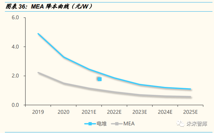 短期國產化、規模化將是降本的主(zhǔ)要(yào)推動,未來功率密度提升帶來(lái)更大降 本空間。國產化 MEA 產品規模化應用(yòng)增強供應商議價能力,大批量采購情 況下上遊原材(cái)料成本有望大幅下降,同(tóng)時規模效應攤薄高昂的設備投入, 帶動 MEA 成本下行。遠期(qī)看,MEA 功(gōng)率密度提升將降低單瓦(wǎ)材料用量, 實現更大(dà)的降本空間。