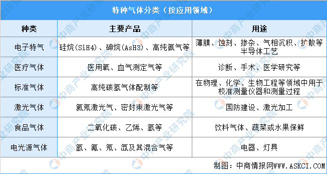 特種氣體是工業氣體的(de)一種,指被應(yīng)用於特定(dìng)領域,對純度、品種、性質有(yǒu)特殊要求(qiú)的工業氣體,占(zhàn)工業氣體(tǐ)的20%。特種氣體按應用領域分類可分為電子特氣、醫療氣體、標準氣體、激光氣體(tǐ)、食品氣體、電光(guāng)源(yuán)氣體等,下遊(yóu)應用涉及電子半導體、化工、醫療環保等行業。