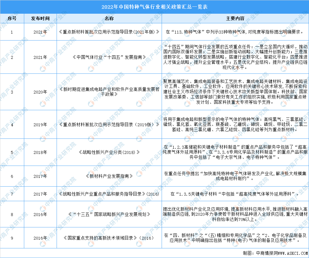 工業氣(qì)體行業是我國產業政策重點(diǎn)支持發展的產(chǎn)業之一,廣(guǎng)泛用於集成電路、冶金、化(huà)工、環保等領域。近年來,為推動工業氣體包括特種氣體在內的關鍵(jiàn)材料國(guó)產化發展(zhǎn),我國政府出台了一係(xì)列政策予以支持和指導。如《重點(diǎn)新材料首批(pī)次應用示範指導目錄(2021年版)》《中國氣體行業“十四五(wǔ)”發展指南》《新時期促進集成電路產業和軟件產業高質量發展若(ruò)幹政策》等。具體政策如下: