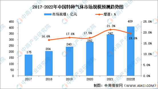 隨著國家(jiā)政策的推(tuī)動、高新技術的發展,以及下遊(yóu)需求的不斷增長(zhǎng),特種氣體市(shì)場規模持續快速增長。數據顯示(shì),中國特種氣(qì)體(tǐ)市(shì)場規模由2017年(nián)的175億(yì)元增長至2021年的342億元,複合年均增長率達18.24%。中商產業研究院預測,2022年我國特種氣體市(shì)場規模將(jiāng)達409億(yì)元。