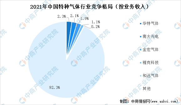 中國特種氣體市場中,國(guó)外公司仍為主流,市場幾乎被發達國家的(de)龍頭企業壟斷,主要龍頭有美國空氣華工、美國普萊克斯、法國液化空(kōng)氣、日本太陽日酸及德(dé)國林德。國產企業產(chǎn)品較為單一,提(tí)純技術(shù)不夠成熟,在市場競爭度(dù)較低。2021年CR5占比(bǐ)約7.7%,前五名包括華特氣體、南大光電、金宏(hóng)氣體、雅克科技、和遠氣體(tǐ),2021年市場份額(é)占比(bǐ)分別為(wéi)2.3%、2.1%、1.9%、1.1%和0.2%。第一梯隊的國產企業特氣業務收入已具備規模性,在細分領(lǐng)域產品優勢明(míng)顯,但和國外龍頭企業相比還有差距。