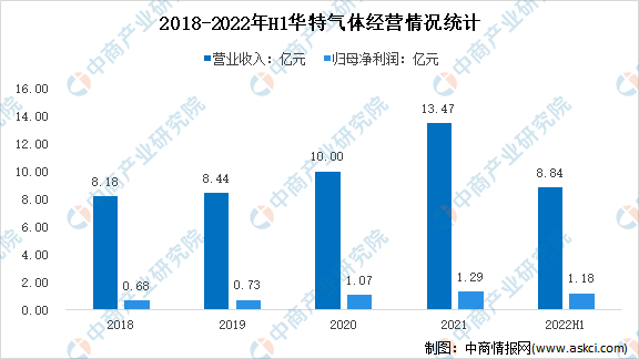 2021年(nián)華特氣體營業收入達13.47億元,同比增(zēng)長34.78%;1.29億元,同比增長21.46%。營業收入增長主要是國內半導體市場需(xū)求增長,特種氣體銷售量對應增(zēng)長(zhǎng)及新增產品(pǐn)和客戶增長所致。2022年上半年實現營業收入8.84億元,歸母淨利潤1.18億(yì)元。