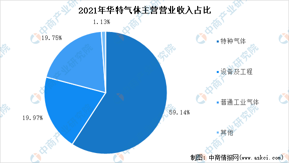 分(fèn)行業來看,2021年華(huá)特氣體主營有特種氣(qì)體、設備及工程、普通工業氣體。其中特種氣體在營收中占比最大,為59.14%,其次設備及工程占比為19.97%,普(pǔ)通工業氣體占比(bǐ)19.75%。