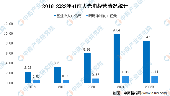 2021年,南大光電實現營業收入9.84億元,同比增長65.46%;歸母淨利潤達(dá)1.36億元,同比增長56.55%。2022年上半年實現(xiàn)營業(yè)收入8.47億元,歸母淨利潤1.44億元。