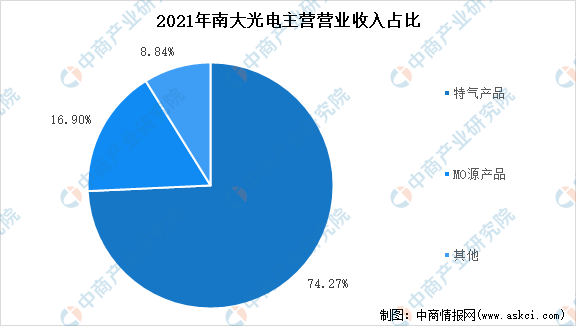 從產品來看,2021年南大光電主要產品有特種氣體、MO源產品等(děng),其中特種氣體占比最高為74.27%,其次是MO源(yuán)產品占(zhàn)比16.9%。