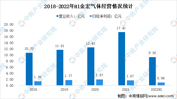 2021年金宏氣(qì)體業績增長迅速,實現收入營業收入17.41億元,同比增長40.05%;實現歸母淨利潤1.67億元(yuán),同比減少15.34%。營業收入(rù)增長主要是金宏氣體積(jī)極把握市場機遇,加大市場開發力度,帶動公司主(zhǔ)營產品銷售(shòu)收入增加所致(zhì)。其中,特種氣體營業收入較(jiào)上年同期增長46.90%,大宗氣體營業(yè)收入較上年同期增長(zhǎng)44.97%。2022年上半年實(shí)現營業收入9.3億元,歸母淨利潤0.98億元。