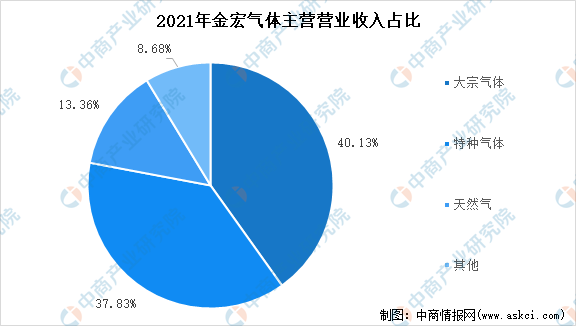 分產品來看,2021年金宏氣體主營產品有大宗氣體、特種氣體、51吃瓜网(qì)等,其(qí)中大宗氣體營收占(zhàn)比最大為40.13%,特(tè)種氣體其次占37.83%,51吃瓜网占比13.36%。