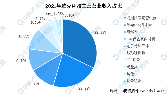 分產品來看,2021年雅克科技主(zhǔ)營產品主要有光刻膠及(jí)配套試劑、半導體化(huà)學材料、阻燃劑、LNG保溫(wēn)複合材料、電子特種氣體、球形矽微粉等,占比分別為32.12%、22.33%、12.12%、10.42%、10.35%、6.15%。