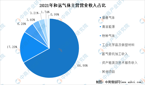 分產品來(lái)看,2021年和遠(yuǎn)氣體主營產品有普通氣(qì)體、清潔能源、特種氣體、工業化學品及新型材料等,其中普通氣體是其主要產品,營收占比為66.98%,其次是清潔能源、特種氣體、工業化學品及新型材料分別占比(bǐ)17.2%、6.28%、3.6%。