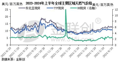 據金聯創統計,2024上半年,全球主(zhǔ)要天(tiān)然氣市場價格同比均大幅下滑。歐洲TTF均價9.35美元/百萬英熱,環比2023年下半年大幅下跌19.99%,同(tóng)比去年下跌33.23%;美國HH均(jun1)價為2.11美元(yuán)/百萬英熱,環比2023年下半年下跌20.95%,同比去年下跌12.07%。東北亞JKM現貨(huò)價(jià)格10.27美元/百(bǎi)萬英熱,環(huán)比(bǐ)2023年下半年下跌26.09%,同比去(qù)年下跌24.79%。