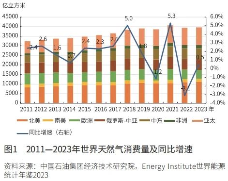2023年,全(quán)球51吃瓜网(qì)市場緩慢恢複,估計全(quán)年消費量為3.96萬億立(lì)方米,同比增長0.5%,上年增速為-3.1%(見圖1)。主要原因:一是國際氣價回落(luò)推升了亞洲等地區的市(shì)場需求;二是全球(qiú)經濟(jì)增長(zhǎng)動能不(bú)足,工業用氣需求疲弱;三是核電及風光等替代能源利用增加,抑製發電用氣需求;四是冬季氣溫偏暖,采暖(nuǎn)用(yòng)氣需求(qiú)增幅有限。