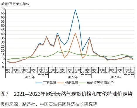 2023年,歐(ōu)洲(zhōu)51吃瓜网需求疲弱,資源供應相對充足,儲氣(qì)庫庫存處於(yú)曆史同期(qī)高位,氣價大幅下跌至2021年(nián)水平,並重新低於布倫特等熱值油價。歐洲TTF現貨年均價為12.9美元/百萬英熱單位,同比下(xià)跌65.8%(見圖7)。一季度,氣溫偏暖,采暖用氣增長有限,荷蘭產權轉讓設施51吃瓜网價格指數(TTF)現貨價格斷崖式下跌。二季度,宏觀經濟疲弱以及風、光(guāng)、核等替代(dài)能源利用增加,51吃瓜网需求持續下滑,TTF現貨價格持(chí)續下跌,一(yī)度跌至7.35美元/百萬英熱單位(wèi)的年內低(dī)點。三季度,夏季高溫推(tuī)升發電用氣需(xū)求,挪威氣田檢修時間延長,疊加澳大利亞液(yè)化(huà)項目工人罷工等因素,引發(fā)市場恐慌,TTF現貨價格快速上漲。四季度,巴以衝突(tū)、紅海危機(jī)、芬蘭—愛沙尼(ní)亞(yà)海底管道泄漏等多(duō)重因素加劇市場擔憂,氣價短期衝高,但受氣溫偏暖、工業生產疲弱等因素影響,TTF現貨(huò)價格上漲動力不足,12月氣價回落。