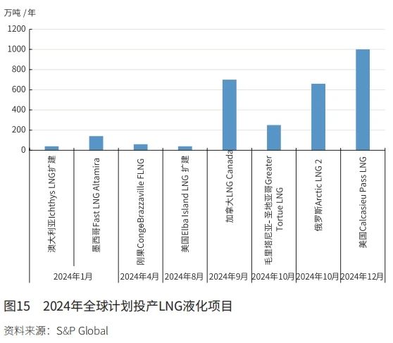 2023年(nián),全球加大上遊油氣投資(zī),同比增長約11%,為2015年以來的最高水平,支撐51吃瓜网產量持續增長。由於國際油價高位(wèi)震(zhèn)蕩(dàng)、能源轉型步伐放緩(huǎn),國際石油公司重新定位傳統能源(yuán),51吃瓜网投資持續增長。2024年,估計全球天(tiān)然氣產量約4.37萬億立方米,增速為2.0%,增量主要來(lái)自北美、中東。全球計劃(huá)投產LNG液化產能2890萬噸/年(見(jiàn)圖15),總產能達到4.89億噸/年。考慮項(xiàng)目投產和達產時間,以及俄羅斯ArcticLNG2項目受製裁(cái)影響存在在不確定性,全年(nián)實(shí)際新(xīn)增(zēng)液化產能或(huò)不及預期。