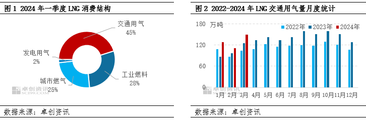 據卓創資訊(xùn)統計,2024年一季度LNG消費結構中,交通用氣占比(bǐ)高達(dá)45%,交通板塊已成為LNG消費的主動力(lì),一季度LNG交通用氣量超過388萬噸(dūn),加氣站銷量同比增長25.65%。其中(zhōng),3月份LNG交通用氣量(liàng)高達150萬噸,同比增長19.23%,環比增長34.96%。