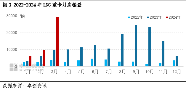 據卓創資訊統計,2024年一季(jì)度中(zhōng)國LNG重卡銷售總量為4.53萬輛,達到了自2014年以來曆時十年的季度最高銷量,較2014年同期翻了八番,同比增幅高達(dá)135.38%,與(yǔ)2022年同期相比翻了近四倍,為曆史五年(nián)來最大同比增幅;環比來看,與2023年四季度相比環比增幅為1.60%。其中,2024年3月LNG重卡銷量為29325輛,達到了自2019年7月以來的峰值,同比增幅(fú)為207.78%,環比增幅為205.72%。2024年一季度,隨著LNG價格逐漸回(huí)歸理性,LNG與柴油價(jià)格相比,其作為燃料的經濟性優勢逐漸得以顯現,使(shǐ)得LNG重(chóng)卡銷量在23年持續增長之後,依然於24年一季度保持了(le)正增長,且於3月份銷量接近3萬,達到新一(yī)輪峰值(zhí)。同時,大宗商品物流需(xū)求不斷釋放,現有運力(lì)的不足為重卡銷量的增長進一步拓寬了空間,LNG重卡保有量繼續增加,且LNG加氣站零售價的下跌,也使(shǐ)得氣頭車對油頭車的替(tì)代越來越明顯,帶動了LNG交通用氣量出現恢複性增長。