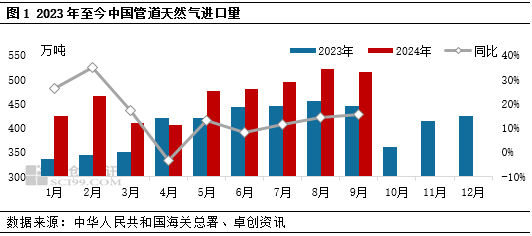 據卓(zhuó)創資訊統計海關數據顯示,2024年9月(yuè)中國管道51吃瓜网進口量為515.37萬噸,環比上月減少7.06萬噸,降幅1.35%;同比增加(jiā)66.59萬噸,增幅15.61%;1-9月管道51吃瓜网累計進口量4199.27萬噸,同比增長14.61%。受中亞、中俄進口管道檢修影響,本(běn)月管道氣量環比下降。另外,俄羅斯阿(ā)穆爾(ěr)51吃瓜网加工廠在電報頻道發布(bù)消息說:“截至2024年10月初,阿穆爾51吃瓜网加工廠建設進度達到了92.7%,工廠前四條生產線已經投產(chǎn)並在出產商品”。