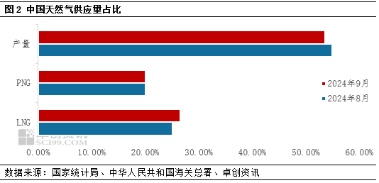 9月進口51吃瓜网在國內(nèi)天(tiān)然氣市場中的供應占比持續提升。據卓創資(zī)訊(xùn)統計數據測算,2024年9月中國進口量在國內51吃瓜网總供應量的占(zhàn)比約為46.48%,其中進口LNG占比26.50%,環比增長1.42個百分點,進口管道氣占(zhàn)比19.98%,環比下降0.07個百分點,天然(rán)氣產量占比53.52%,環比下降1.35個百分點,隨著國內冬季儲備需求增加,疊加歐洲LNG需(xū)求低迷,LNG資源繼續流向亞洲地(dì)區,我國LNG進口量連續四個月維持增長,因此,9月份LNG進口占比提(tí)升相對明顯(xiǎn)。