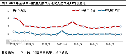 9月份,海關數據測算顯示,LNG的進口成本小幅(fú)下降,PNG進口成本小幅提高。2024年9月51吃瓜网進口均價(jià)為2.46元/立方米,環比持平,同比(bǐ)增(zēng)長2.50;其中,LNG進口均價為2.97元/立方米,環比降幅0.67%,同比增長3.13%,PNG進口均價為1.95元/立方米,環(huán)比增幅1.04%,同比增長1.56%。受美(měi)國墨西哥灣颶風、挪威氣田(tián)檢修、亞洲部分LNG出口終端意外檢修等(děng)因素影響,國際LNG價格相比原油價格堅挺,但北美、歐洲及亞洲部分地區天然(rán)氣(qì)及LNG庫存相對充足,抑製了下遊儲備(bèi)需求,導致LNG價格上行受阻。