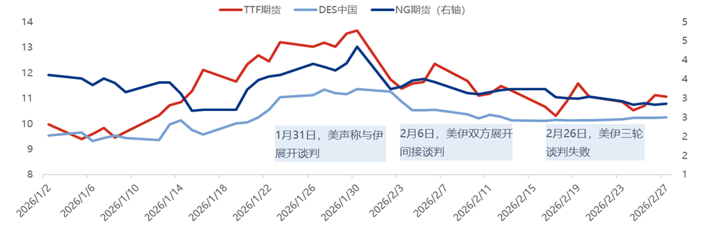 市場對前期對(duì)美伊衝突一直持有樂觀態度,多數機構預測美伊(yī)雙方衝(chōng)突將止步於“桌麵”,難以對國際LNG供應及價格產(chǎn)生較強影響,故而在2月內國際LNG價格震蕩(dàng)下行。但衝突發生後,截至2026年3月2日,TTF期貨開盤價格為39歐元/MW,漲幅為22.03%,代表東北亞市(shì)場變化的JKM收盤價15.068美元/百萬英熱,環比上漲40.86%,可見市場對於未來LNG供應存在較大擔憂。